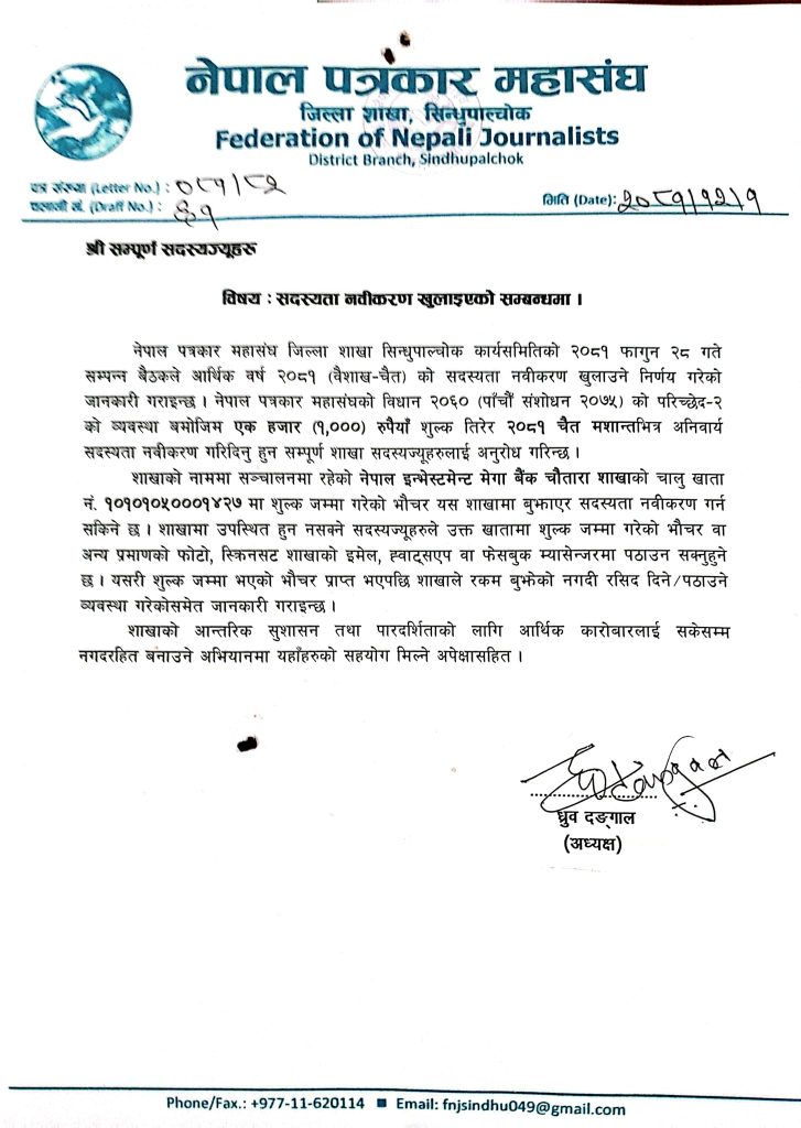 नेपाल पत्रकार महासंघ जिल्ला शाखा सिन्धुपाल्चोक कार्यसमितिको २०८१ फागुन २८ गते सम्पन्न बैठकले आर्थिक वर्ष २०८१ (वैशाख–चैत) को सदस्यता नवीकरण खुलाउने निर्णय गरेको जानकारी गराइन्छ । नेपाल पत्रकार महासंघको विधान २०६० (पाँचौँ संशोधन २०७५) को परिच्छेद–२ को व्यवस्था बमोजिम एक हजार (१,०००) रुपैयाँ शुल्क तिरेर २०८१ चैत मशान्तभित्र अनिवार्य सदस्यता नवीकरण गरिदिनु हुन सम्पूर्ण शाखा सदस्यज्यूहरुलाई अनुरोध गरिन्छ ।