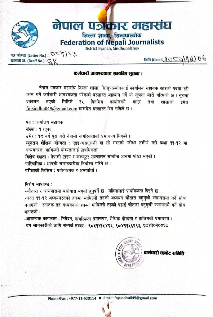 नेपाल पत्रकार महासंघ जिल्ला शाखा, सिन्धुपाल्चोकलाई कार्यालय सहायक स्तरको पदमा रही काम गर्ने कर्मचारी आवश्यकता परेकाले दरखास्त आह्वान गर्दै यो सूचना जारी गरिएको छ । सूचना प्रकाशन भएको मितिले १५ दिनभित्र कार्यालयमै आएर तथा शाखाको इमेल ालवकष्लमजगण्द्धढ२नmबष्।िअयm मासमेत दरखास्त दिन सकिने छ ।