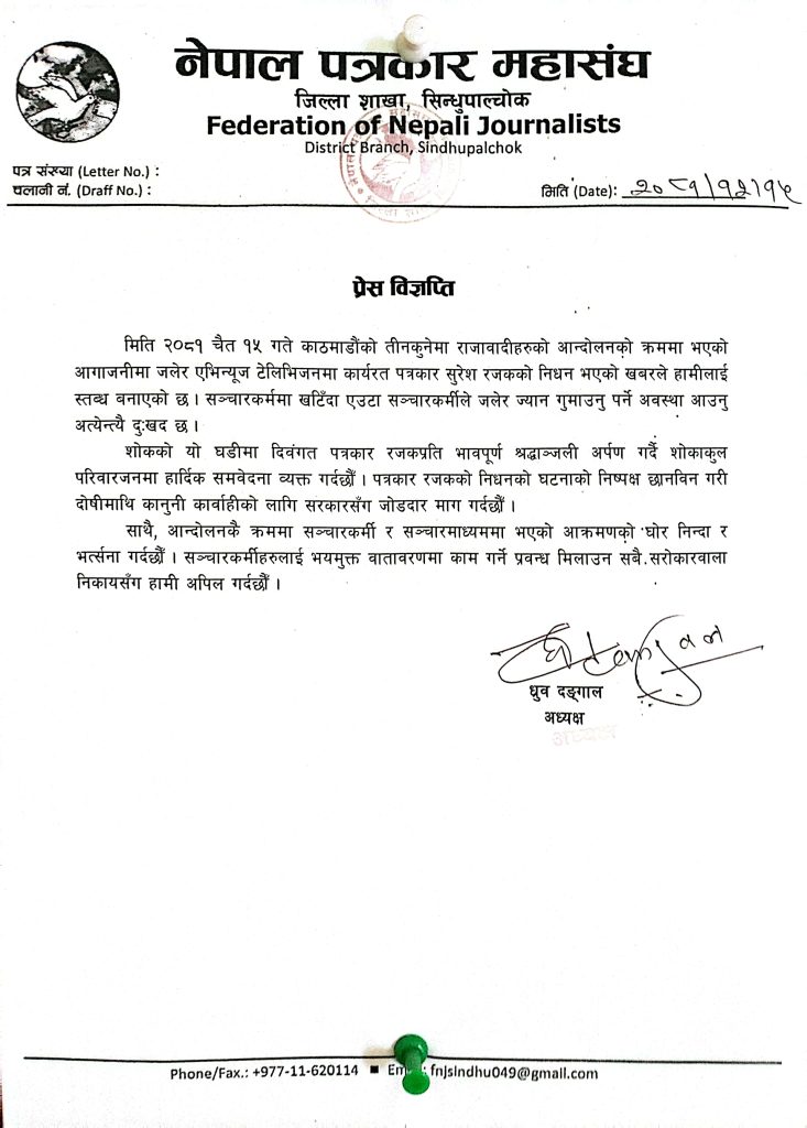 साथै, आन्दोलनकै क्रममा सञ्चारकर्मी र सञ्चारमाध्यममा भएको आक्रमणको घोर निन्दा र भत्र्सना गर्दछौँ । सञ्चारकर्मीहरुलाई भयमुक्त वातावरणमा काम गर्ने प्रवन्ध मिलाउन सबै सरोकारवाला निकायसँग हामी अपिल गर्दछौँ ।