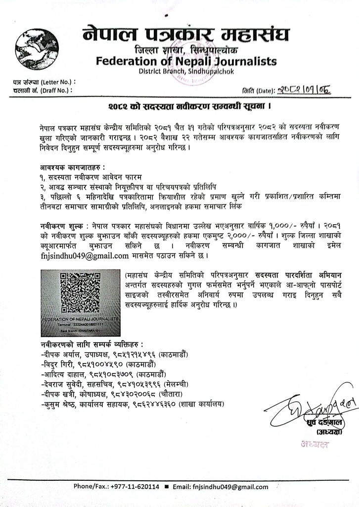 नवीकरण शुल्क : नेपाल पत्रकार महासंघको विधानमा उल्लेख भएअनुसार वार्षिक १,०००/– रुपैयाँ । २०८१ को नवीकरण शुल्क बुझाउन बाँकी सदस्यज्यूहरुको हकमा एकमुष्ट २,०००/– रुपैयाँ । शुल्क जिल्ला शाखाको क्यूआरमार्फत बुझाउन सकिने छ । नवीकरण सम्वन्धी कागजात शाखाको इमेल fnjsindhu049@gmail.com मासमेत पठाउन सकिने छ ।