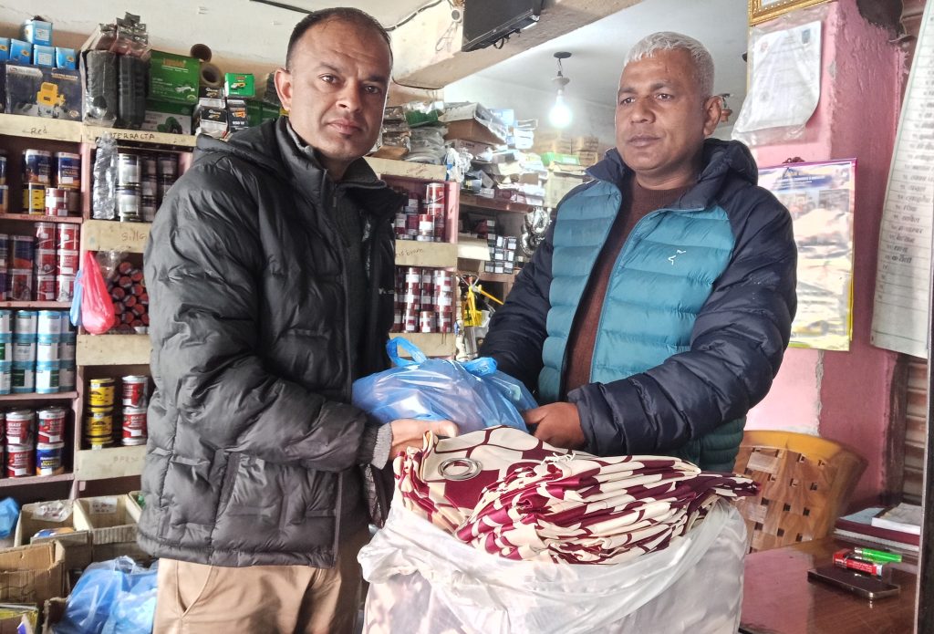 शाखा कार्यालयको बाँकी १० झ्यालको लागि पनि छद,पर्दा उपलब्ध गराउने भन्दै समाजसेवी थापाले थप सामाग्री उपलब्ध गराएका हुन् । चौतारामा रहेको पसलमै बोलाएर उनले आइतबार शाखा अध्यक्ष ध्रुव दंगाललाई सामाग्री हस्तान्तरण गरेका थिए ।